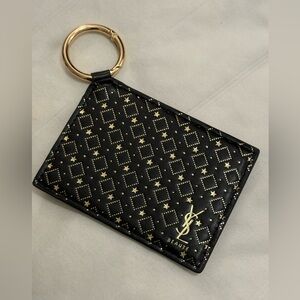 The mirror keychain was given as a gift with purchase (GWP). The keyring is made of black material with a gold star pattern and features the YSL Beaute logo. It is a portable, leatherette mirror with a ring attachment. The keyring has approximate dimensions of 3.5 inches by 2.5 inches.