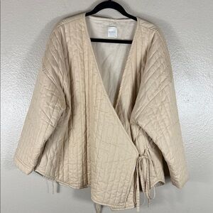 The Curved Quilt Jacket is a top that features a wrap front with side ties, a curved hemline and a boxy dropped shoulder fit in plush cloud-like quilting for comfort and warmth. Designed to layer as a jacket or on its own.