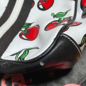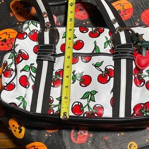 Chic shoulder bag with playful cherry design. Features sturdy black straps. Never used… 2 small marks as shown in pictures, comes with cherry charm and change purse.