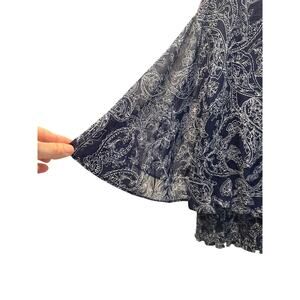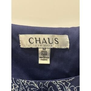 Chaus Women’s Medium Dark Blue-colored blouse with a white paisley print. The blouse has a scoop neckline and smocked waist, with ruffled sleeves. The blouse is a Chaus Smocked Dolman Top - Paisley - Floral Top. Chaus is a fashion brand for women's apparel that offers stylish and high-quality clothing for modern women.