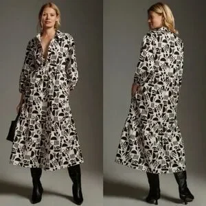Maeve Anthropologie Bettina Black and White Graphic Long Sleeve Dress