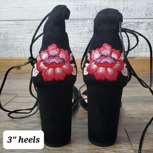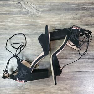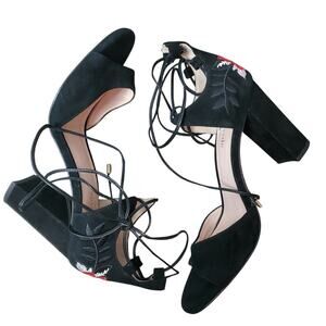 Kate Spade Oasis Lace-Up Suede Heels Floral Embroidered Sandals Black Size 6.5