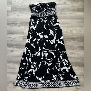 Stylish maxi dress with a striking black and white design. Ideal for versatile wear.