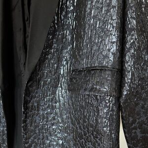 Elegant black blazer with a textured finish. Features a sleek design and classic lapel. Great for many occasions - think new yearβs eve night out with your beau. Formalize any casual outfit with this shiny and metallic jacket.