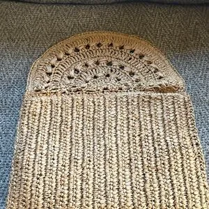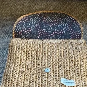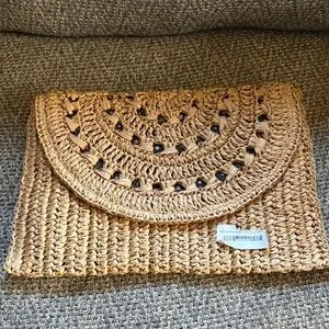 Discover elegance with this beautifully woven clutch. Featuring a sophisticated tan and navy design, it's the perfect accessory for any occasion.