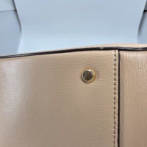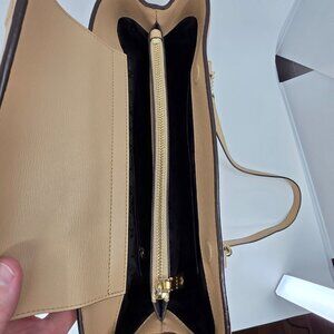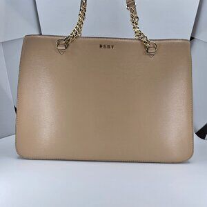 Chic DKNY tote in cream leather. Features elegant gold chain accents. Perfect for versatile styling. My mom loved I but only used it a hand full of times.