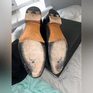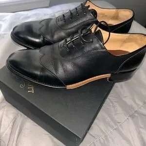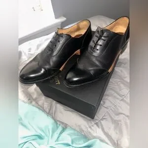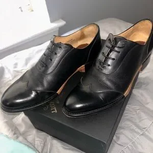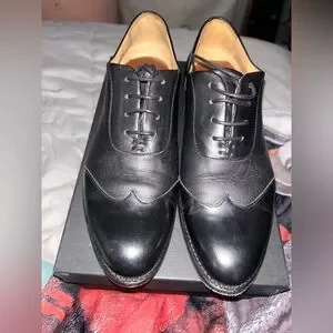 Preowned Black leather wing tip oxford shoe narrow fit size 39. Insole removed.
