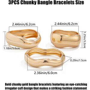 Features: These bold, chunky gold bangles feature an irregular geometric design that adds a modern edge to your look. Stackable for a layered vibe, perfect for dressing up or casual chic. Lightweight at just 1.6 ounces, so they feel comfortable all day.