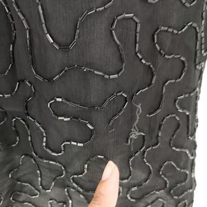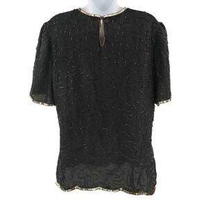 This exquisite vintage top showcases intricate beadwork and sequins on a black base, forming bold decorative patterns in pink, gold, and iridescent hues. The short sleeves, scalloped hem, and beaded edging enhance its elegance, while the textured bodice adds dimension and charm. Perfect for formal events or glamorous evenings, this piece exudes vintage sophistication.