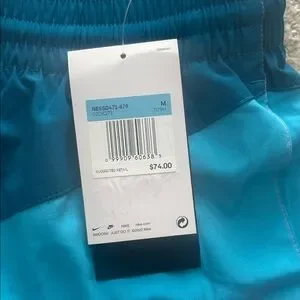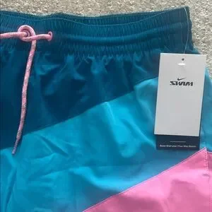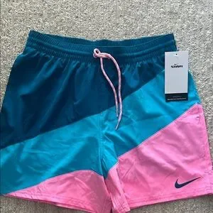 Stylish Nike swim shorts with teal and pink colorblock design. Features a comfortable fit and drawstring waist.