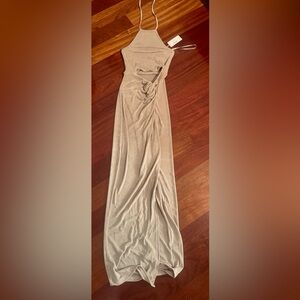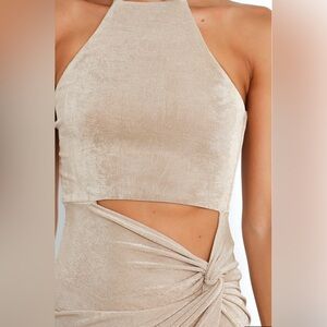Take your night-time look to the next level with this stunning maxi dress! Featuring a halter neckline that ties close and front cut out under bust, you will be sure to make an entrance. The stretch material gives you a comfortable fit that is perfect for any occasion. If you are in between sizes, we do suggest selecting the size down due to the to stretch in this fabrication.