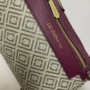 Stylish and versatile, this Liz Claiborne bag features a chic burgundy and cream design.