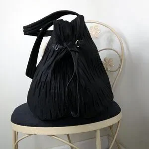 * Crisp pleated black satin tote cinches from 15" to 21" wide