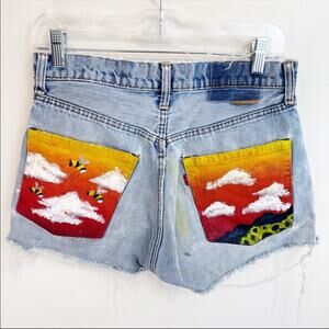 Custom hand painted one of a kind paper tag vintage Levi's denim shorts, size small. Size on tag is 30, see approximate measurements. Heavily distressed.