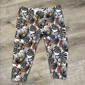 Colorful leggings with tropical floral design. Features black, white, and multicolor patterns. Comfortable and stylish.