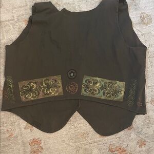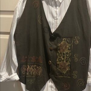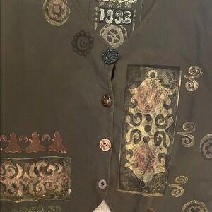 Unique dark olive vest with artistic patterns. Features artistic buttons for closure. Ideal for layering. Vintage piece for 1993. Bust is 52”. Length front is 25”. Back is 16”