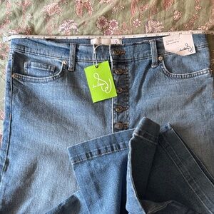 Brand new. They have some light stretch. Can be worn cropped. Short girl friendly. The fit reminds me more of palazo pants.