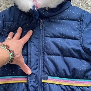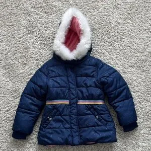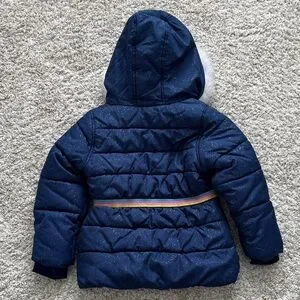 Cozy blue jacket with soft pink lining. Features a charming design. In excellent condition. Worn once. Zipper closure. Pockets on the sides. Perfect for the chilly weather.