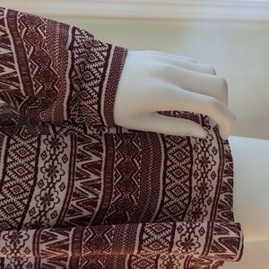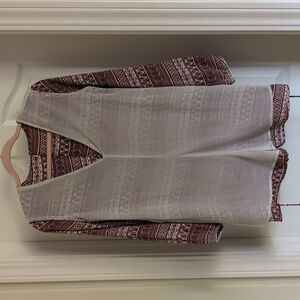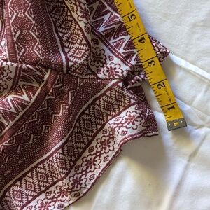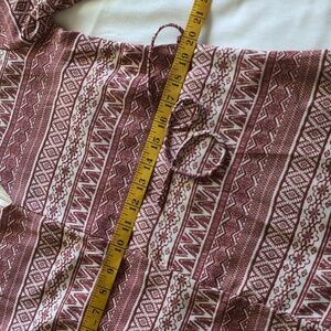 LUSH brand short romper with long sleeves. Red brick color Aztec pattern on cream color background.
