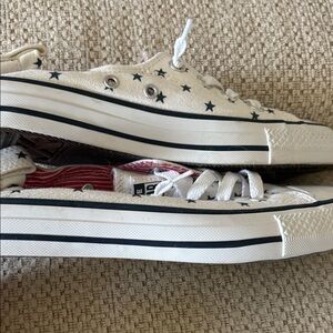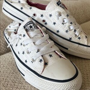 Stylish Converse sneakers with blue star patterns. Durable and comfortable. Never worn
