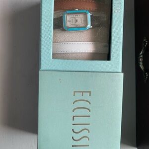Elegant watch with turquoise bezel and black leather strap. Silver dial with distinct markers.