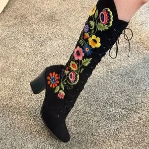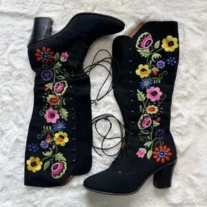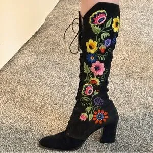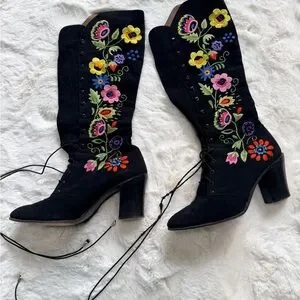 💫STUNNING & RARE Vintage 60s 70s soft black suede kidskin knee-high hippie bohemian gogo granny boots w/ amazingly vibrant paisley floral embroidery & beading throughout. Only for the true vintage collector, snag these up as they are getting harder to find!