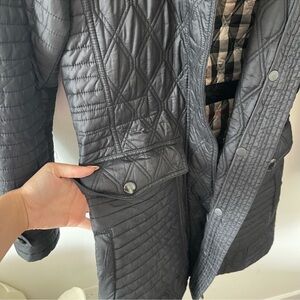 Elegant black quilted design. Features classic Burberry lining. Ideal for warmth and style.