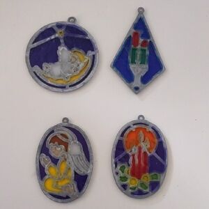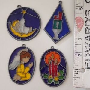 Set of four stained glass style ornaments. Features vibrant designs with purple, yellow, red, and green colors.