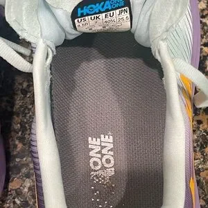 Stylish Hoka shoes with light blue upper and purple sole. Orange logo detail adds a pop of color. Size 8 1/2 clean and from a smoke free home nice preowned condition. Normal signs of usage. Please refer to all photos.