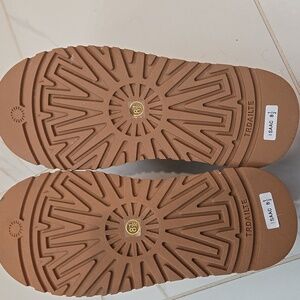 Cozy tan slip-on shoes with fuzzy texture. Features red accents and a sturdy brown sole. Perfect for casual wear.