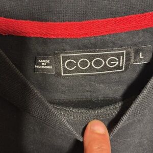 This COOGI black short sleeve tee features a striking array of colorful patches that add a bold touch to its casual design. The vibrant emblems stand out against the classic black fabric, making it a perfect choice for a stylish, laid-back look.vintage