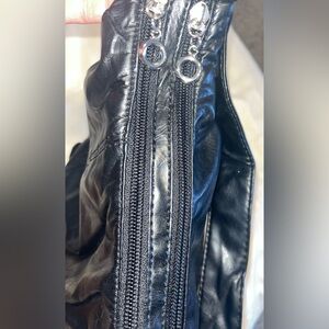 2 top zippered compartments. 1 zippered pocket on back for phone or other small objects. 1 large compartment has 2 pockets. The other large compartment has a zippered pocket. Chic black shoulder bag with woven accents. Perfect for daily use. Adds elegance to any outfit.
