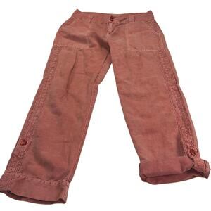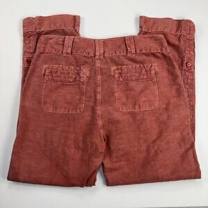 Elegant straight leg pants with option to roll up with button closure. Features intricate side detailing. Perfect for casual outings. Nice pants but the fit was tight for me in hip area. hip measurement ~ 18.5” waist ~ 15”. Inseam ~ 27” No stretch. Small spot below right front pocket appears to be glue.
