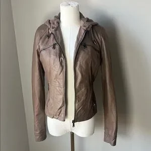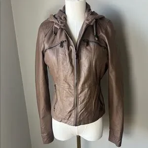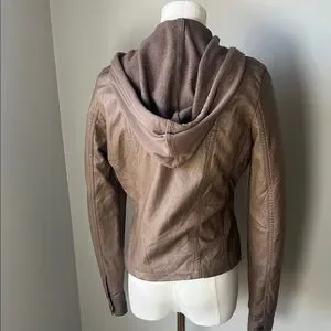 Upgrade your wardrobe with this stylish tan vegan leather jacket. Featuring a comfortable hood and sleek design, it's perfect for any outing. I doubt I ever wore. No noted defects. Sold as is. Open to reasonable offers.