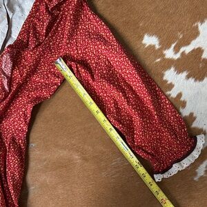 This elegant red dress features a charming lace trim, perfect for any occasion. The classic design offers a timeless look. Vintage 70s cottage core/ prairie dress. See measurements. No flaws.