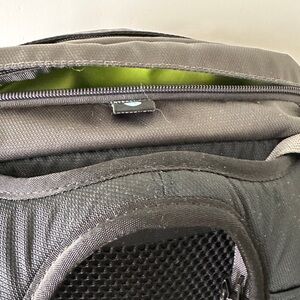 Osprey light daypack backpack. Charcoal gray/black color. Lime green interior. Mesh pockets on sides, top small zip pocket & top zip access to interior. Inner sleeve for laptop or water bladder with straw/hose slot. Inner zip pocket.
