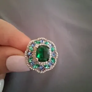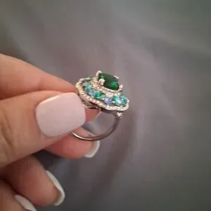 Step i to elegance with this breathtaking statement ring featuring a vibrant emerald green center stone, surrounded by a sparkling halo of blue and green simulated gemstones. The floral- inspired design adds timeless, regal touch to any outfit- perfect for those who love unique jewelry with character. Size 8.