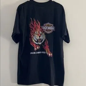 Bold black tee featuring a fierce tiger and flame design. Iconic Harley-Davidson logo included.