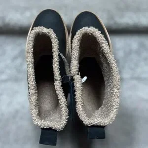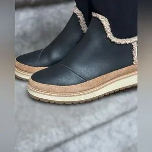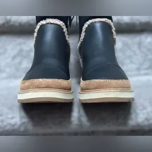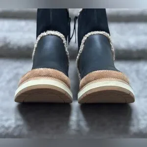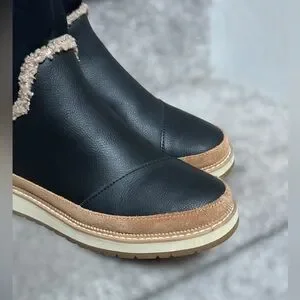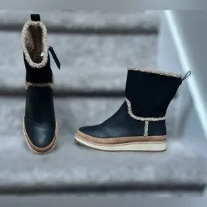 Toms Makenna black leather shearling boots cozy winter shoes waterproof suede booties warm fleece lined ankle boots black tan neutral minimalist modern casual chic winter essential cold weather footwear comfy sherpa lined boot women’s size 6 capsule wardrobe fall winter fashion snow boots