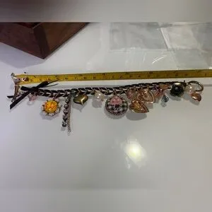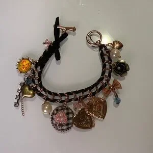 This nostalgic charm bracelet features a stunning combination of gold and black, adorned with heart charms and intricate details. Perfect for adding a touch of sophistication to any outfit. Betsey Johnson.