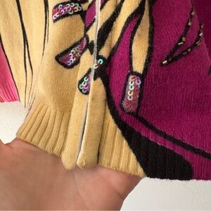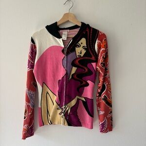 80% wool, 20% acrylic. Full zip front with hood and gem detail throughout. Stripped back and diva image on front.