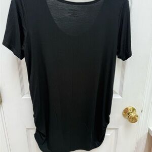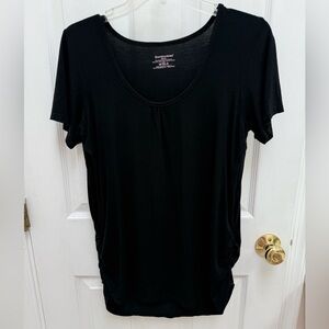 Soft and comfortable Bamboobies nursing top in size medium. Classic black color with a scoop neckline and discreet side ruching, designed for easy nursing access. Made from a 95% bamboo viscose and 5% spandex blend for a breathable, stretchy, and flattering fit.