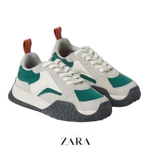 Modern and stylish Zara Kids sneakers crafted with a mix of leather and textile for comfort and durability. Featuring a gray base with green accents, lace-up design, and chunky black rubber sole for extra grip and support. Perfect for everyday wear, school outfits, or sporty casual looks.