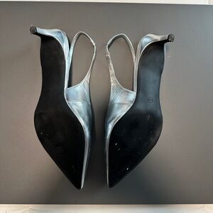Chic Calvin Klein slingback heels in metallic silver. Perfect for elevating any look.