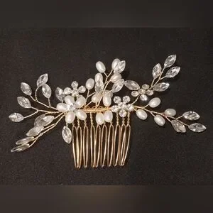 Stunning gold hair comb with crystal and pearl accents.
