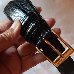 Black Leather Ralp Lauren Belt with Gold Buckle. Croc Alligator Print. Size Smal