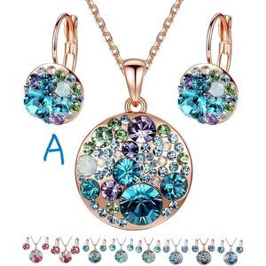 Pendant Size: 0.9" x 1.1" | Earring Size: 0.51" x 0.51" | Stone: XIRIUS hotfix rose crystals, round shape, light sapphire blue, green, and clear white | Plating: silver plated, 0.5mm | Chain Length: 18" + 2" | Clasp: Lobster Claw | Earring Hooks: level hooks