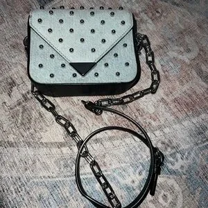 Stylish crossbody bag with studded detail. Features a chain strap for added flair. Perfect for versatile wear. There is some markings as noted on pictures but barely noticed. Hard-style makes this a really useful cute bag for going out. The strap is removable to use as a clutch. Clean inside lining.