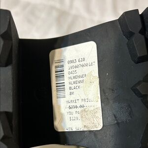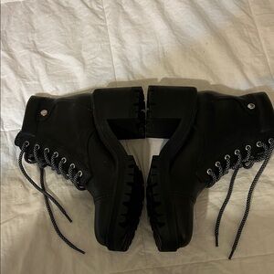 Stylish black leather combat boots. Features unique patterned laces. Durable and chic design. New with tags retails for $239. Silver accents. Size 8 M, super cute and super sexy, dressed up or down