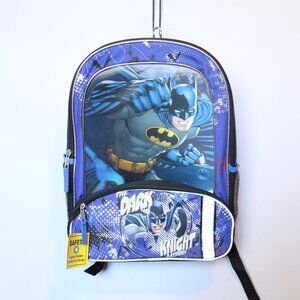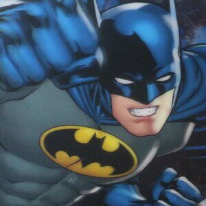 This "Dark Knight Batman" backpack that utilizes a lenticular design to create a 3D effect on the main front panel. It has a main zippered compartment, a front zippered pocket, and two mesh side pockets. The shoulder straps are adjustable and padded for comfort. Approximate dimensions: 16" H x 12" W x 4" D. It is new with tags.